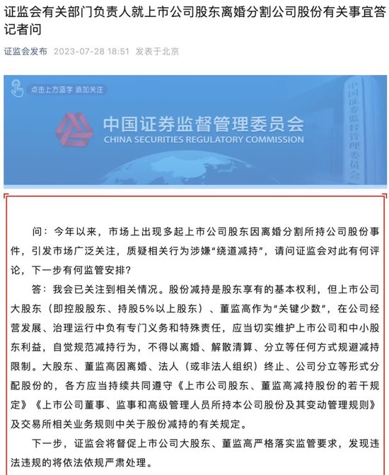 7月28日,证监会有关部门负责人答记者问时表示,证监会已关注到相关情况。股份减持是股东享有的基本权利,但上市公司大股东、董监高作为“关键少数”,在公司经营发展、治理运行中负有专门义务和特殊责任,应当切实维护上市公司和中小股东利益,自觉规范减持行为,不得以离婚、解散清算、分立等任何方式规避减持限制。大股东、董监高因离婚、法人(或非法人组织)终止、公司分立等形式分配股份的,各方应当持续共同遵守减持规则。