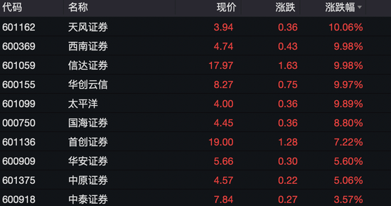 作为行情风向标,券商板块今天上午涨势趋缓,但依旧实现整体上涨。截至发稿,天风证券、西南证券、信达证券、华创云信、太平洋等涨停。此外,券商龙头中信证券上午惯性上冲,盘中涨幅一度超过5%,后涨幅收窄。