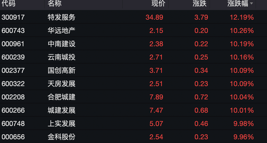 房地产板块再次领涨,板块盘中涨幅超过3%,华远地产、中南建设、天房发展、国创高新等10余股盘中冲击涨停。