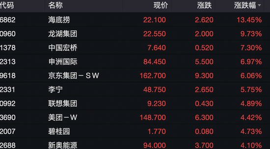 港股市场上午也表现强势,恒生指数盘中涨幅超过2%,恒生指数成份股中,海底捞、龙湖集团暴涨。