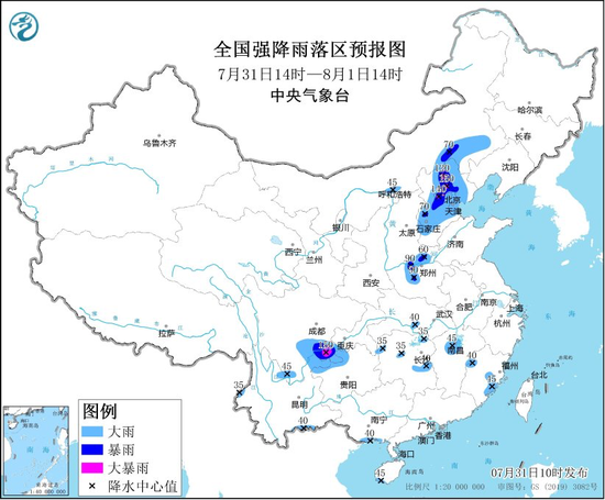 中央气象台于7月31日10时继续发布暴雨红色预警:预计7月31日14时至8月1日14时,内蒙古东南部、河北大部、北京、天津、四川盆地东南部、贵州西北部、云南东北部等地部分地区有大到暴雨,其中,河北北部沿山、北京北部和西南部、四川盆地东南部等地部分地区有大暴雨(100~150毫米)。