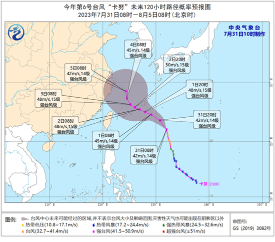 预计“卡努”将以每小时15-20公里的速度向北偏西转西北方向移动,强度还将有所增强,最大强度可达强台风级(42-50米/秒,14-15级),8月2日夜间移入东海,逐渐转向偏北方向移动,移速明显减慢。