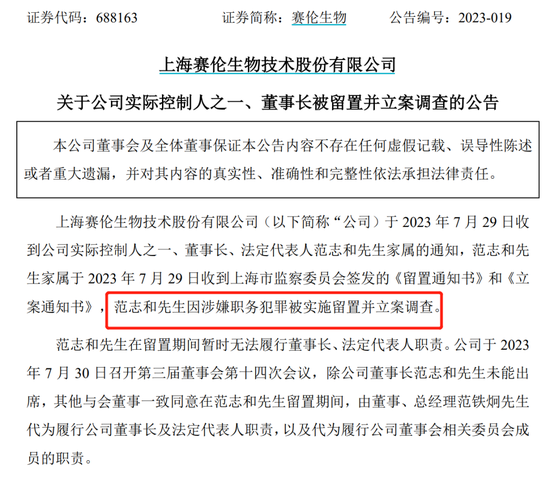 7月30日,赛伦生物公告称,公司实际控制人之一、董事长范志和涉嫌职务犯罪被实施留置并立案调查。正是这一消息造成了赛伦生物股价在次日跳空大跌。