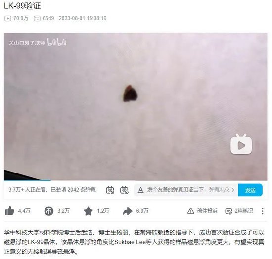8月1日下午,LK-99验证登上B站热搜首位。B站博主“关山口男子技师”发布LK-99验证视频,视频说明为华中科技大学材料学院博士后武浩、博士生杨丽,在常海欣教授的指导下,成功首次验证合成了可以磁悬浮的LK-99晶体,该晶体悬浮的角度比Sukbae Lee等人获得的样品磁悬浮角度更大,有望实现真正意义的无接触超导磁悬浮。