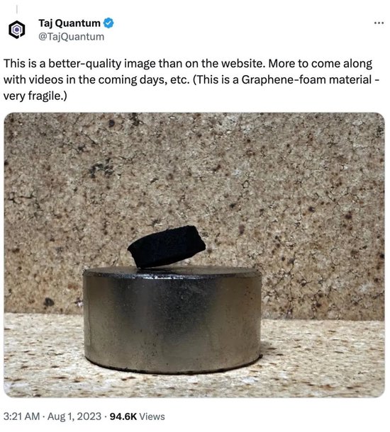 对此,李世燕表示,美国泰吉量子公司宣称的室温超导体中主要包含穿孔石墨烯,而热解石墨是已知的常温下抗磁性最强的物质,可以轻易实现磁悬浮,因此该公司展示的磁悬浮很可能和热解石墨的磁悬浮有关,要想说明为室温超导体的话,还需要看到零电阻。该团队尚未公布任何实验数据,尤其是与磁化、电阻等相关的实验数据,其宣称的发现还有待实验验证。