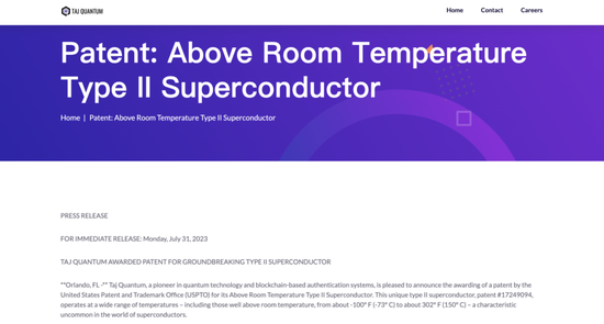 与此同时,前述美国泰吉量子公司宣布的室温超导体专利也引发了广泛关注。美国公司泰吉量子(Taj Quantum)于北京时间8月1日凌晨发布消息称,其被授予了高于室温的第II类超导体的专利。但这家公司并没有公布任何实验数据,尤其是与磁化、电阻等相关的实验数据。