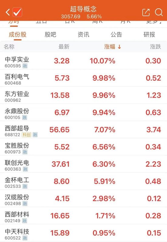 8月1日午后,A股市场上,超导概念股集体大涨。截至收盘,中孚实业、百利电气、永鼎股份等个股收于涨停。西部超导和联创光电分别涨超7%和6%。