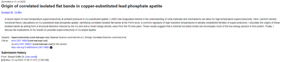 国际标准时间(UTC)7月31日18时许,预印本网站arXiv上出现了一篇来自美国劳伦斯伯克利国家实验室(LBNL)的文章,其结果支持LK-99作为室温环境压力超导体。论文摘要显示,论文唯一作者Sinéad Griffin对铜取代的铅-磷灰石结构进行了密度泛函理论计算,确定了费米能级的相关孤立平带,并称这是超导晶体的标志。她的发现被认为是为铜掺杂铅磷灰石的超导性找到了理论基础。