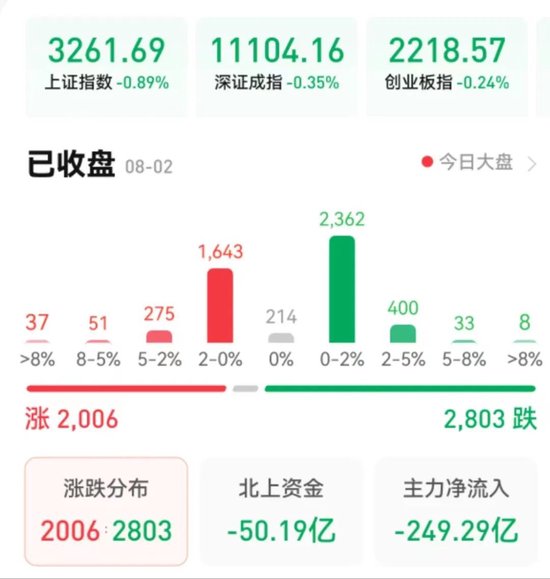 周三(8月2日),A股三大股指震荡下行。截至收盘,上证指数跌幅0.89%报3261.69点,深证成指指跌0.35%报11104.16点,创业板指跌0.24%报2218.57点;两市合计成交金额8360.15亿元。北向资金中止连续6日净买入,净卖出50.19亿元,其中,沪股通净卖出33.8亿元,深股通净卖出16.4亿元。总体来看,A股个股跌多涨少,其中,涨停个股达33只,跌停个股没有。