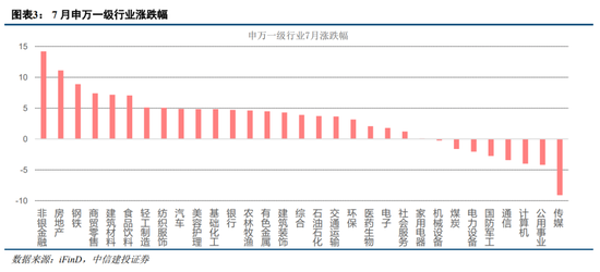 在2023年二季度经济转弱的情况下,7月初市场已经开始对月末的政治局会议相关政策进行博弈,同时陆续出台的稳增长政策提振了市场信心。中国人民银行、金融监管总局7月10日发布《关于延长金融支持房地产市场平稳健康发展有关政策期限的通知》,将“金融16条”适用期限统一延长至2024年12月31日,支持房地产市场和金融市场平稳运行;7月18日,商务部、国家发改委等13部门发布关于促进家居消费若干措施的通知,旨在解决制约居民“能消费、敢消费、愿消费”的痛点和堵点; 7月19日,中共中央、国务院发布关于促进民营经济发展壮大的意见,意见围绕持续优化民营经济发展环境、加大对民营经济政策支持力度、强化民营经济发展法治保障、着力推动民营经济实现高质量发展;7月21日国常会通过《关于在超大特大城市积极稳步推进城中村改造的指导意见》,再次强调要加大保障性住房建设和供给; 7月21日,国家发展改革委等13个部门联名印发《关于促进汽车消费的若干措施》和《关于促进电子产品消费的若干措施》,再次加码促消费力度。顺周期板块在政策的持续催化下表现良好,7月24日中央政治局会议召开后,在扩大内需、促进民间投资、优化调整房地产政策、活跃资本市场等方面对下半年经济工作进行了全面部署。重磅政策的出台与7月初市场的博弈方向一致,加速了顺周期的行情,非银金融和房地产板块领涨也带动了大盘风格的走强。