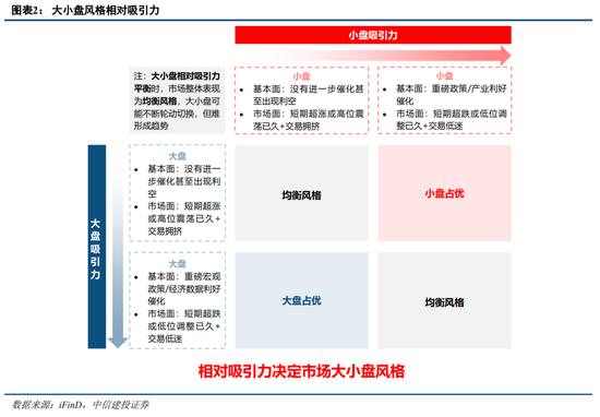 当小盘吸引力强而大盘吸引力弱时,小盘占优;当大盘吸引力强而小盘吸引力弱时,大盘占优;如果大小盘的吸引力同时较弱,大盘可能体现为均衡风格,这种情况可能见于牛市超涨后的阶段;如果大小盘的吸引力同时较强,大盘也会体现为均衡风格,这种情况可能见于熊市超跌后的阶段。而如果大小盘的相对吸引力并没有非常明确的分别,那么市场则有可能在大小盘之间来回轮动,但难以形成一个持续时间较长的趋势。