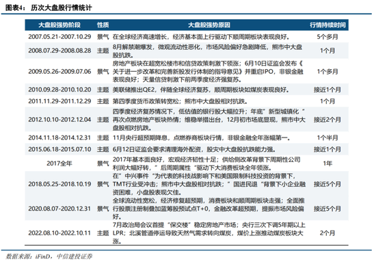通过复盘07年以来的12次持续时间较长的大盘股行情,我们发现大盘行情的持续时间在一个月到一年时间不等,其中偏景气性质行情将持续更长时间,而偏主题性质行情大多持续一个月。