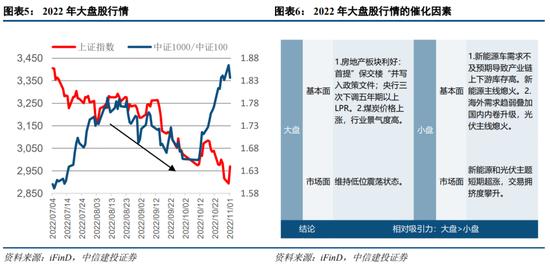 2022年全年经济低位运行,7月31日公布的制造业PMI为49,低于预期的50.4,在经济不及预期的情况下,8月份和9月份的煤炭板块、房地产和非银金融板块表现良好,带动大盘风格的走强。在地产板块方面,7月28日,中央政治局会议首提“保交楼”,并将其写入政策文件,稳定房地产市场成为下半年工作核心。与此同时,2022年,央行三次下调5年期以上LPR共计35个基点,为2019年房贷利率换锚LPR之后降息力度最大的一年。5月首套商贷利率下限调整为不低于5年期以上LPR减20个基点,9月允许部分城市阶段性下调或取消首套商贷利率下限,政策利好推动以房地产为代表的顺周期板块大涨,大盘股相对于小盘股更具有吸引力。煤炭板块方面,6、7月美联储分别加息75BP,导致市场担忧宏观经济衰退,但随着7 月美联储加息完成,宏观最鹰派时刻已过,未来衰退风险下降。除了宏观经济的预期向好外,俄乌冲突爆发,北溪管道无法按时重启,进入无限停运期,从而导致天然气的代替需求转向煤炭,对煤炭价格上涨形成支撑,涨价预期也带动了煤炭板块的走强,煤炭板块的高景气度进一步增加大盘股的相对吸引力。