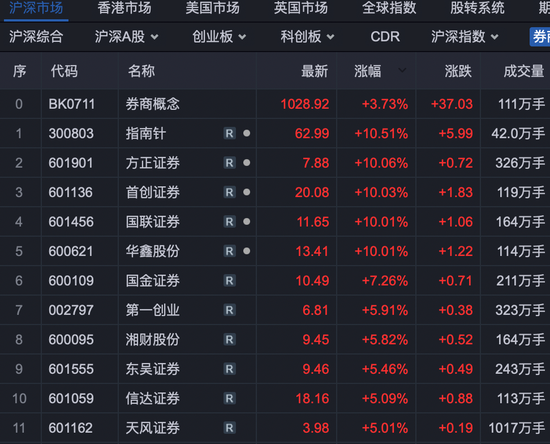券商股板块中,今天有多只个股涨停,比如方正证券、首创证券、国联证券、华鑫股份。另外,第一创业、国金证券、湘财、天风等都表现不错。券商相关的指南针大涨超过10%,财富趋势上涨8%,同花顺上涨近5%。