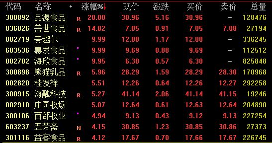 食品饮料股盘中走势活跃,截至收盘,品渥食品“20cm”涨停,盖世食品涨近15%,麦趣尔、海欣食品、惠发食品等涨停,熊猫乳品涨约6%。