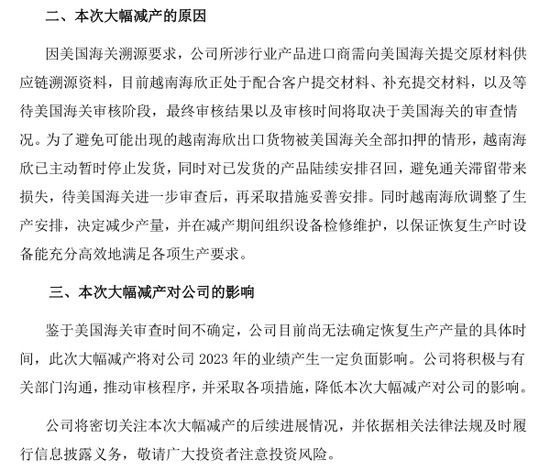 昨日晚间,海象新材发布公告称,公司全资子公司越南海欣新材料有限公司决定自2023年8月4日起大幅减产。鉴于美国海关审查时间不确定,公司目前尚无法确定恢复生产产量的具体时间,此次大幅减产将对公司2023年的业绩产生一定负面影响。