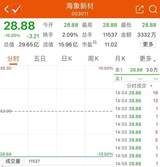 受子公司大幅减产影响,海象新材开盘一字跌停。截至收盘,海象新材报28.88元,最新总市值约30亿元。