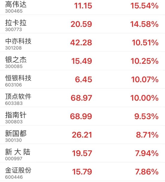 金融科技板块同步走强,高伟达、拉卡拉、中亦科技等涨超10%,恒银科技、顶点软件涨停,指南针涨超9%。