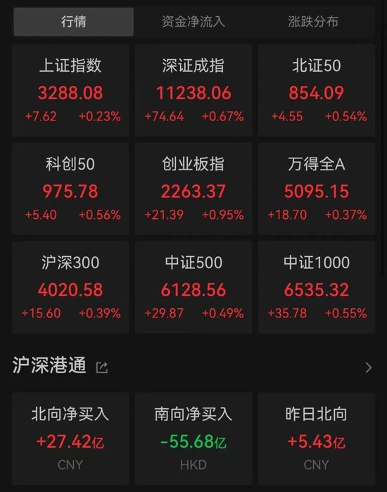 周五,受证券业“定向降准”等利好刺激,A股三大指数均高开,盘中最大涨幅均超过1%,但收盘涨幅有所缩窄。截至收盘,上证指数涨0.23%,深证成指涨0.67%,创业板指涨0.95%。沪深两市成交额再次突破万亿元,金额为10492亿元。北向资金持续进场,全天净买入27.42亿元。