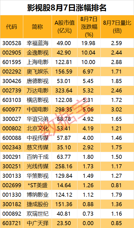 伴随行业复苏,影视板块今年走势明显反弹。数据宝统计,截至8月7日收盘,影视股今年以来平均涨幅达到31.31%。上海电影、奥飞娱乐、唐德影视、幸福蓝海涨幅超50%。