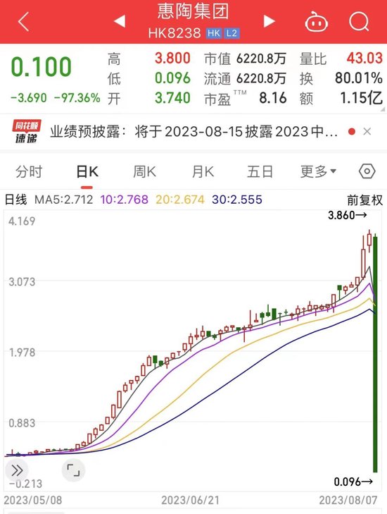 然而,仅1个交易日的时间,惠陶集团股价被打回原形。8月7日,公司收盘总市值仅0.62亿港元,总市值一日缩水22.95亿港元,约合人民币21亿元。
