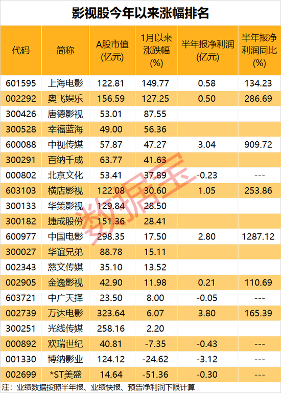 截至目前,按照半年报、业绩快报、预告净利润下限的业绩数据来看,超半数影视股上半年净利润同比增长。6只影视股净利润预计扭亏为盈,分别是中视传媒、奥飞娱乐、横店影视、万达电影、上海电影。