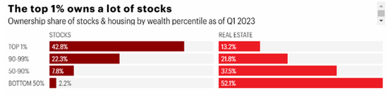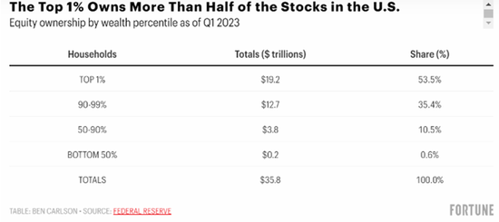 再看股票市场,会发现所有权分配更加不平衡。前1%的人拥有超过53%的股票,前10%的人则持有89%的股票,股票是美国历史上长期回报率最高的资产类别,股市的大涨造就了资产进一步向富人集中: