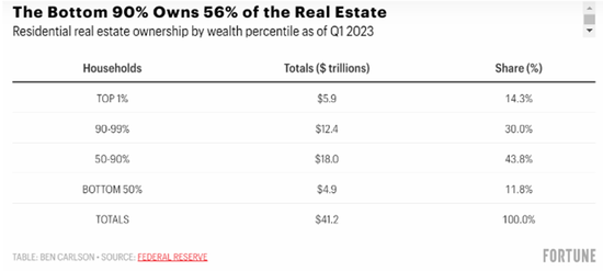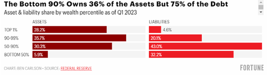 最后我们看看房地产市场,尽管还是存在一定贫富差距,但情况就要相对平等得多:财富排名最底层的90%人仅拥有11%的股票市场,但他们控制着56%的房地产市场。底层50%的人拥有不到1%的股票市场,但拥有近12%的房地产市场。这有助于解释为什么底层90%的家庭负债如此之高,因为这些家庭大多数都有抵押贷款债务需要偿还。