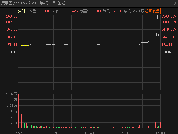 事实上,爆炒低价新股在A股市场早有先例,将时间拉回到2022年8月,创业板注册制实施后上市的首批新股之一康泰医学也曾上演过一日30倍的神化。首发价仅有10.16元的康泰医学2020年8月24日上市首日尾盘遭资金爆炒,最高价一度飙涨至308元,盘中最大涨幅2931%,收盘大涨1061%。