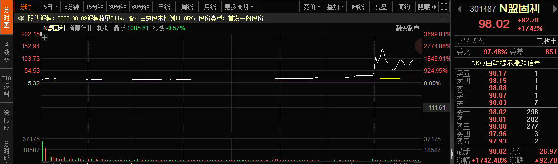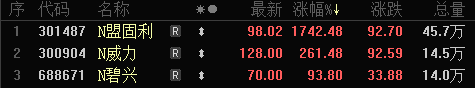 今日上市的2只创业板股威力传动、盟固利以及科创板新股碧兴物联集体暴涨,涨幅最小的碧兴物联也大涨93%,涨幅最高的盟固利则一度暴涨近37倍,截至收盘,该股报收98.02元,涨超17倍。