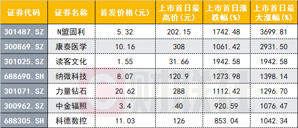 据财联社统计,近3年来,上市首日盘中涨幅超过10倍的新股共有7只,分别是盟固利、康泰医学、读客文化、纳微科技、力量钻石、中金辐照、科德数控,这其中又以前两股的表现最为吸睛,盟固利、康泰医学当日最大涨幅均在30倍左右。不过以当日最终收盘情况来看,中金辐照、科德数控均跌出了“10倍股”阵营。