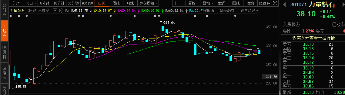 力量钻石上市首日一度大涨12.96倍,当日最高价一度触及288元,随后股价震荡调整,股价跌破200元关口后再度走强,盘中最高价一度升至366.64元。以目前的前复权价格计算,力量钻石相较于上市首日最高价股价跌幅近52%。
