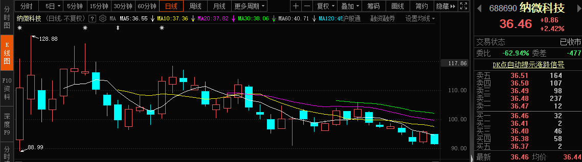 纳微科技上市首日最高大涨13.98倍,当日最高价为120.9元,值得注意的是,该股次日又延续涨势,最高价触及128.88元。该股目前收盘价为36.46元,相较于上市首日最高价股价跌幅接近70%。