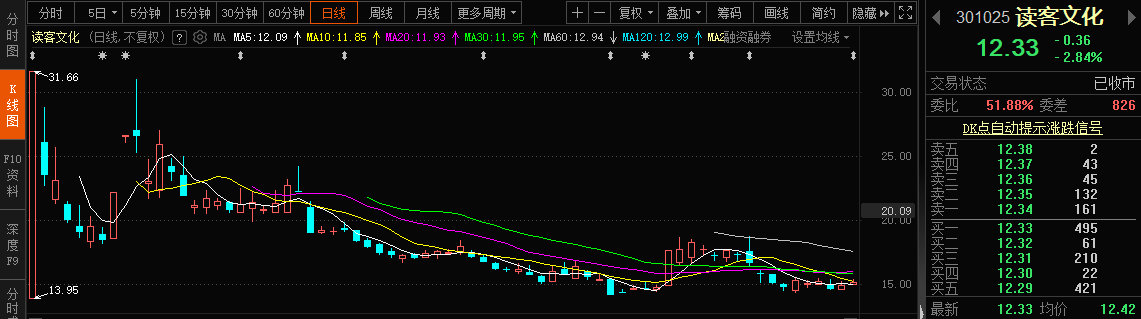 读客文化上市首日最高大涨19.42倍,当日盘中最高价为31.66元,该股首日暴涨后股价一度调整跌破18元,随后展开二波攻势盘中最高价一度回升至31元。不过目前股价仅有12.33元,相较于上市首日最高价跌幅达61%。