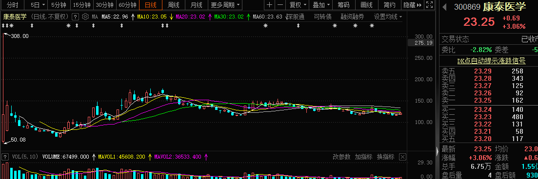 康泰医学上市首日最高大涨29.31倍,当日盘中最高价触及308元,这一价格也成为该股史上最高价,虽然随后该股股价有所反弹,但都没突破200元。截至目前,康泰医学收盘价为23.25元,相较于上市首日最高价股价跌幅超90%。