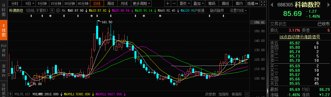 科德数控上市首日最高大涨10.42倍,当日最高价触及126元,该股上市后盘整月余随后再度开启一波新的涨势,最高价触及161.5元。截至目前,科德数控收盘价为85.69元,相较于上市首日最高价股价跌幅接近40%。