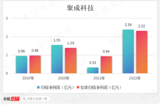 2021年10月,赶在IPO前夕,聚成科技突击分红2.3亿元,近乎达到当年净利润0.33亿的7倍;如果拉长时间线,这个数字就是一下子分走2019-2021年累计盈利的八成以上。
