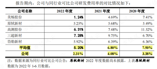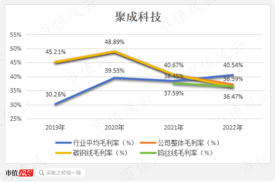 在钨丝线的低毛利作用下,聚成科技的毛利率也从行业均值以上,退到了行业均值以下,2022年为37.19%。
