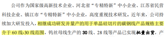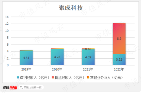 聚成科技的业绩突增,是由于钨丝线完成技术开发并实现量产,贡献了8.9亿营收,占到总营收的72.51%,相较去年增长了近70%。