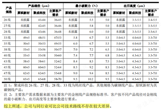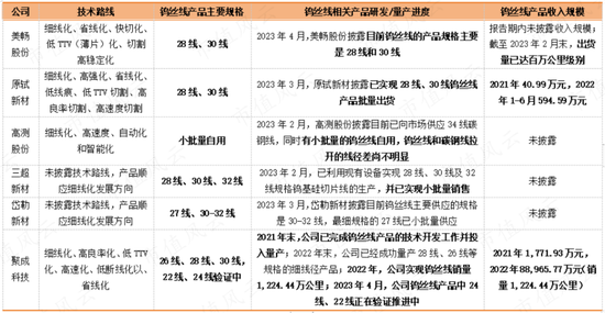 综合对比后,无论是研发进度、量产能力、收入规模、产品最小规格,聚成科技在钨丝线领域都有明显领先,且差距不小。