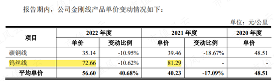 碳钢线,则从营收支柱变为营收小弟,2022年营收3.22亿,同比下滑29.86%,占总营收的26.25%。