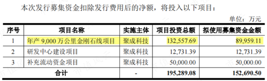 此次,聚成科技拟IPO募资15.27亿,其中9亿用于建设年产9,000万公里金刚石线项目,1.27亿用于搞研发,5亿用于补流。