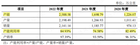 但事实上,聚成科技的现有产能为2,588.58万公里,产能利用率84.93%,并未达到满产状态。也就是说,募投扩张产能将是现有产能的3.47倍。
