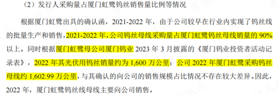 2021-2022年,聚成科技钨丝母线采购量占厦门虹鹭(厦门钨业子公司)钨丝母线销量的90%,基本算是称霸了钨丝母线市场供应量。
