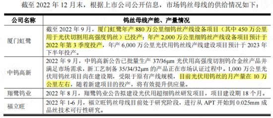 如今,已有不少金刚线厂商着手布局钨丝线,除了聚成科技以外,还有美畅股份(300861.SZ)、高测股份(688556.SH)、三超新材(300554.SZ)等。