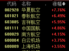 机场航运板块中,华夏航空涨超7%,春秋航空、吉祥航空等涨幅居前。
