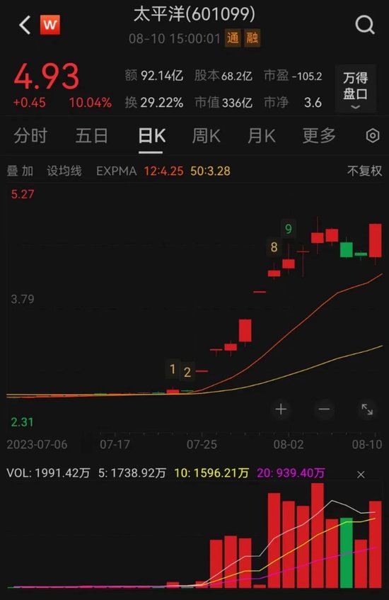 其中,太平洋尾盘涨停,成交额超92亿元,高居A股榜首。7月24日以来,该股已涨超80%。