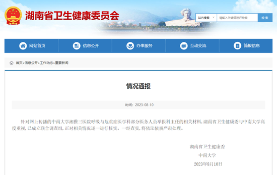 据新华社报道,针对网上传播的中南大学湘雅三医院呼吸与危重症医学科部分医务人员举报科主任的相关材料,湖南省卫生健康委与中南大学高度重视,已成立联合调查组,正对相关情况逐一进行核实。一经查实,将依法依规严肃处理。