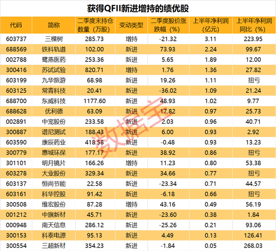 QFII二季度增持三棵树、明月镜片、维宏股份、苏试试验、鹏鼎控股等;其中苏试试验的QFII持股数量增加最多,较一季度末增加379.16万股,持股比例增加0.49个百分点。
