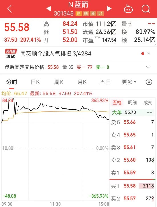 8月10日,新股N蓝箭盘中一度涨超360%,早盘开盘15分钟即触发二次临停。截至收盘,该股上涨207.41%,收盘价55.58元。